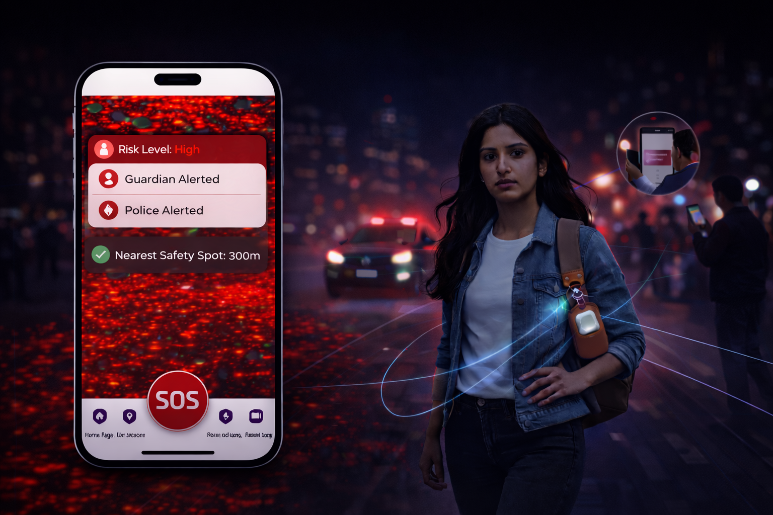 Sakhi combines wearable safety devices and predictive risk intelligence engine to instantly connect users with trusted guardians, law enforcement, and community networks.